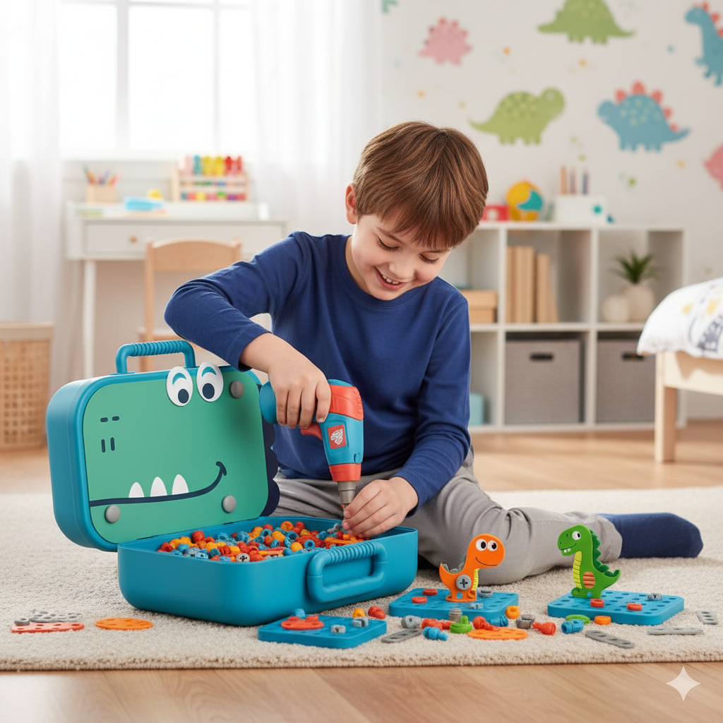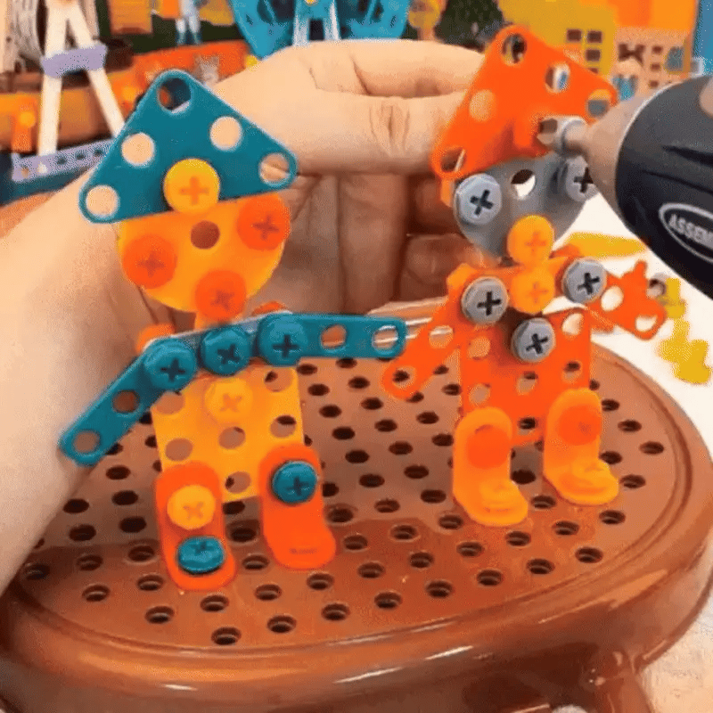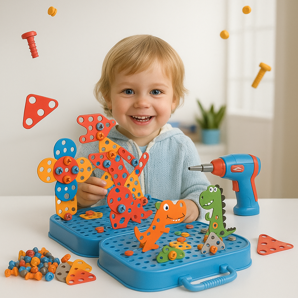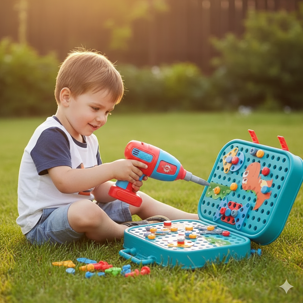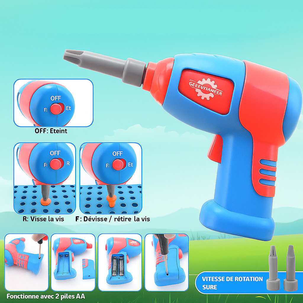Grâce à sa visseuse à piles et ses outils adaptés, il apprend à visser, assembler et créer en toute sécurité. Un jeu qui développe sa motricité, sa confiance et sa fierté de “faire comme les grands”. 🌟