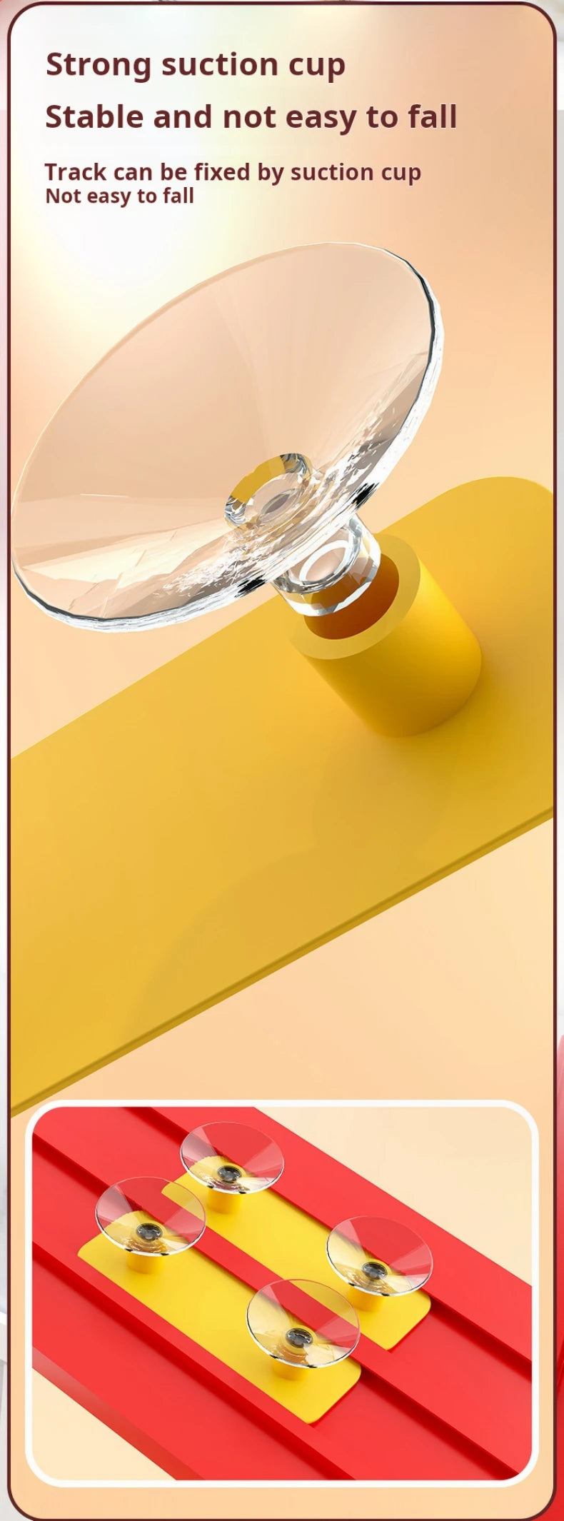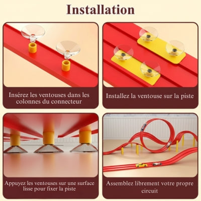 Grâce aux ventouses, la piste se fixe sur murs, meubles, fenêtres.
