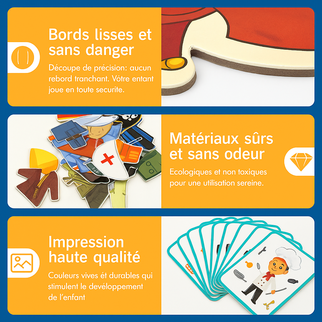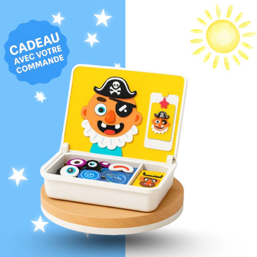 Votre enfant choisit un univers, place les pièces magnétiques sur le décor et les déplace jusqu’à former sa scène. Les aimants l’aident à positionner et superposer facilement, dès 3 ans, sans frustration.